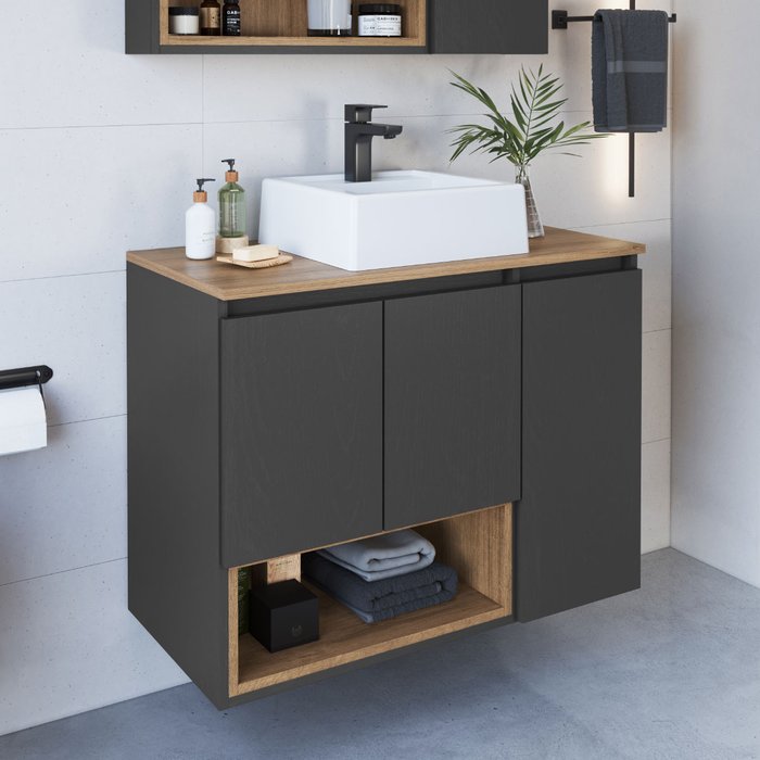 Gabinete Suspenso com 3 Portas e Cuba Branca Inclusa 80 Cm Cor:mel com Grafite Mel com Grafite