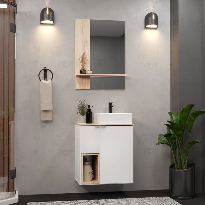Gabinete Suspenso com Cuba e Espelheira 60cm Lisboa Móveis Bosi Branco/Faia