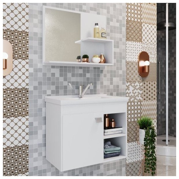 O Gabinete suspenso para Banheiro com Cuba Bia é desenvolvido com estrutura em MDF 12 mm/MDP 15 mm, acabamento em pintura U.V.! Com Cuba em mármore sintético, puxador plástico polipropileno, características que garantem melhor mais durabilidade e resistência ao produto. Além disso tudo, o conjunto ainda acompanha uma linda Espelheira com espelho 3 mm, 1 prateleira e 1 nicho para você guardar sua escova de dentes, creme dental, etc. Aproveite e adquira já o seu conjunto para deixar o seu ambiente ainda mais charmoso e elegante.