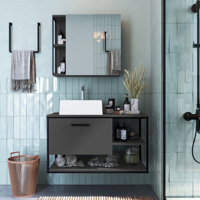 Gabinete Suspenso para Banheiro 80cm com Espelheira e Cuba Preto/Mel
