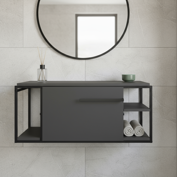 O gabinete para banheiro industrial da Placa & Ponto P1019 é perfeito para quem deseja sofisticação e praticidade! Possui uma porta basculante, dois nichos e ainda 1 porta toalha! Sua estrutura é em metal e porta, tampo e prateleiras em MDP. Não acompanha cuba.