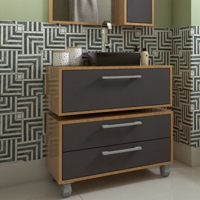 Gabinete Suspenso para Banheiro Com Cuba Preta 80cm 1 Basculante e Balcão 2 Gavetas Alice Mel/Grafite