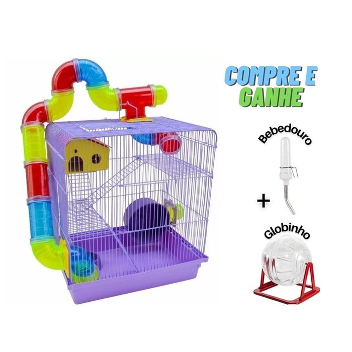 Gaiola Hamster Tubos 3 Andares Lilás 26x38x43 Com Kit Globinho e Bebedouro Jel Plast