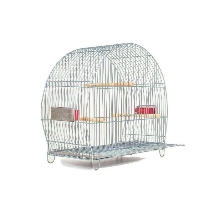 Gaiola, comedouros, poleiros e uma bandeja de metal para recolher as fezes.