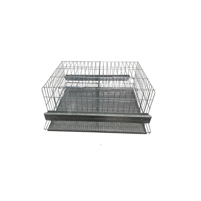 Acompanha uma chapa de aço galvanizada abaixo do piso inferior, ela sai para facilitar a limpeza dos excrementos. (as aves não tem contato com as fezes pois essa chapa fica abaixo do piso da gaiola)