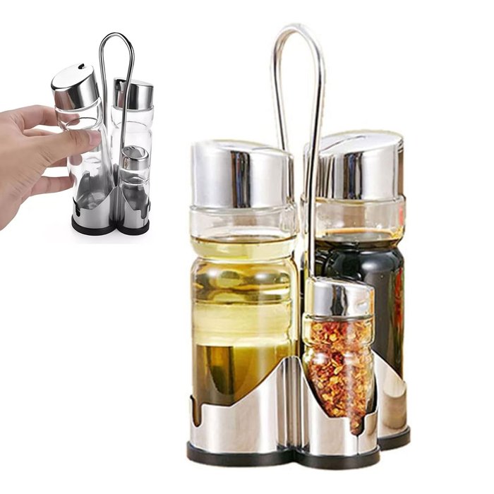 Galheteiro de Vidro 4 Peças Vinagre Pimenta Sal Azeite Suporte Mesa Restaurante Casa Condimento Temp Prata