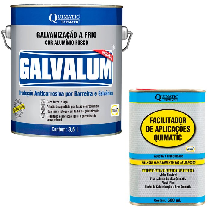 | Itens Inclusos | (01) GALVALUM Galvanização a Frio Aluminizada 3,6 L Quimatic Tapmatic (01) Facilitador de Aplicações Quimatic Diluente 500 mL Quimatic Tapmatic |
