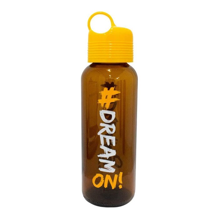 O squeeze da Casambiente é produzido em vidro espesso resistente na cor marrom com acabamento de ótima qualidade. A garrafa possui a escrita Dream On que em português significa Continue Sonhando.