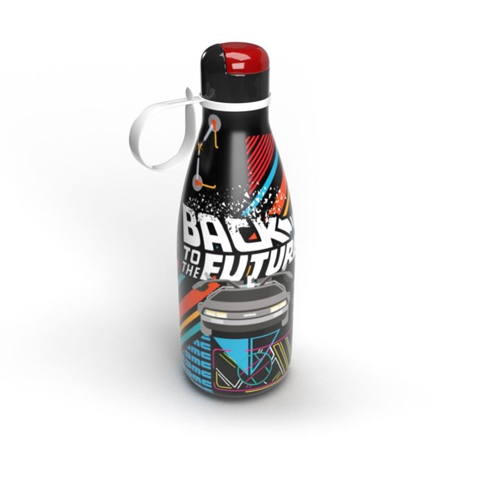 Garrafa temática de Back To The Future (De Volta para o Futuro). Produzido por Steven Spielberg, o primeiro filme "Back to the Future" (De Volta para o Futuro) deu origem a uma franquia seguida de duas continuações no cinema, games e uma série animada. Imortalizado pelo ator pelo ator Michael J. Fox, Marty McFly é um típico jovem estudante norte-americano, que através de uma máquina do tempo, criada em um carro DeLorean DMC-12 por seu melhor amigo, o cientista Dr. Emmett "Doc" Brown, volta ao passado de sua cidade do ano 1985 para 1955. Ao interagir acidentalmente com seus pais ainda jovens, McFly causa mudanças em seu futuro que podem apagar sua existência, assim, ele tem que correr contra o tempo para restabelecer fatores cronológicos e voltar ao seu tempo natural no futuro.