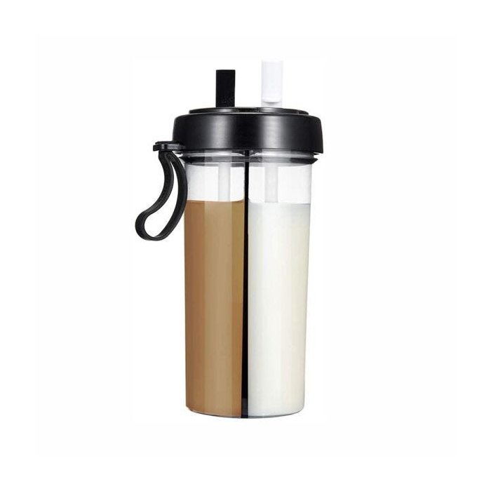 PROJETO PRÁTICO E EFICAZ: O espaço dividido pode conter diferentes bebidas, como leite e café, e as diferentes bebidas têm seus próprios canudos. É muito divertido desfrutar de duas bebidas diferentes.