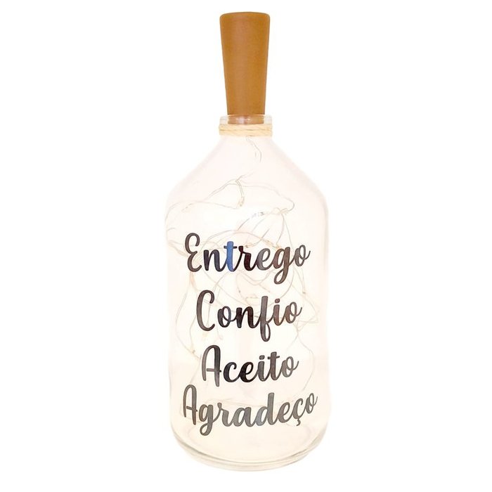 Garrafa de vidro. 500 ml. Pode ser usada como garrafa tradicional, como aromatizador de ambiente, como cachepô para decorar com plantinhas.. use a criatividade!Já acompanha fio com iluminação em LED e bateria.Dimensão da garrafa : 17cm X 8cmObs. As frases gravadas no vidro são decalque e não adesivos colantes. Os decalques passam por um processo de fundição em forno industrial. Por isso, não descascam como os adesivos comum, pois são fundidas na peça.