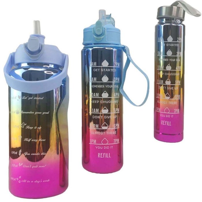 Garrafa Motivacional Metalica 2 Litros 900ml 300ml Kit 3 Uni Squeeze Agua Cha Viagem Passeio Academia Treino Trabalho Casa Home Office