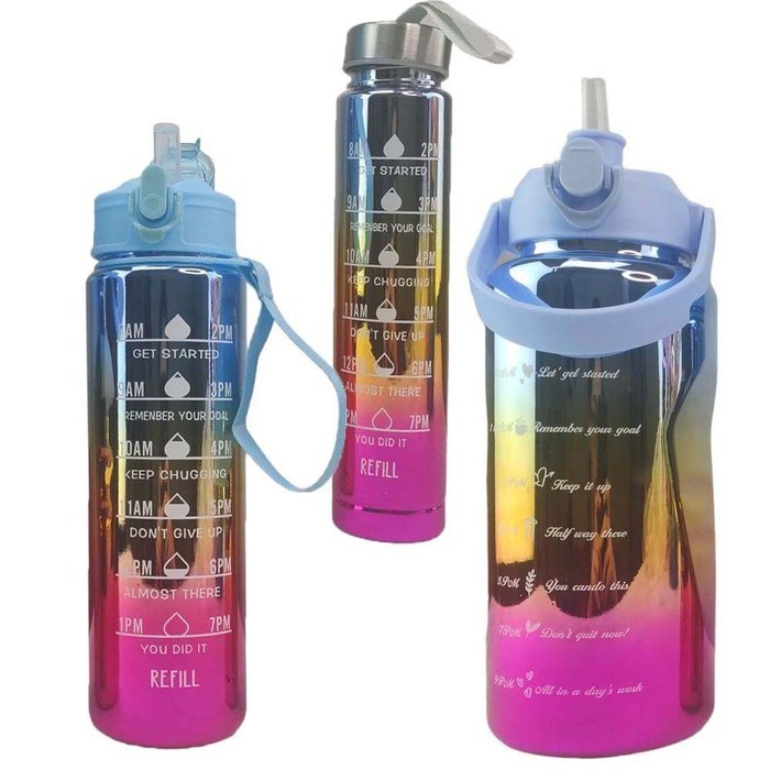 Atenção: Anuncio referente a um kit com 3 Garrafas, sendo uma de 2 Litros, outra de 900ml e a menor de 300ml.Atenção: as frases estão inglês.Prática, a garrafa é ideal para se manter hidratado em qualquer hora e lugar.