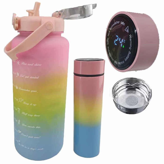 Garrafa Motivacional Squeeze Termica Kit 2 Uni Sensor Led Temperatura Medidor Agua Cha Bebida Viagem Degradê, rosa, amarelo e azul