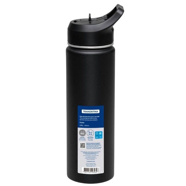 Garrafa Térmica com Canudo 650ml Preta Tramontina Squeeze Aço Parede Dupla Gelado Preto