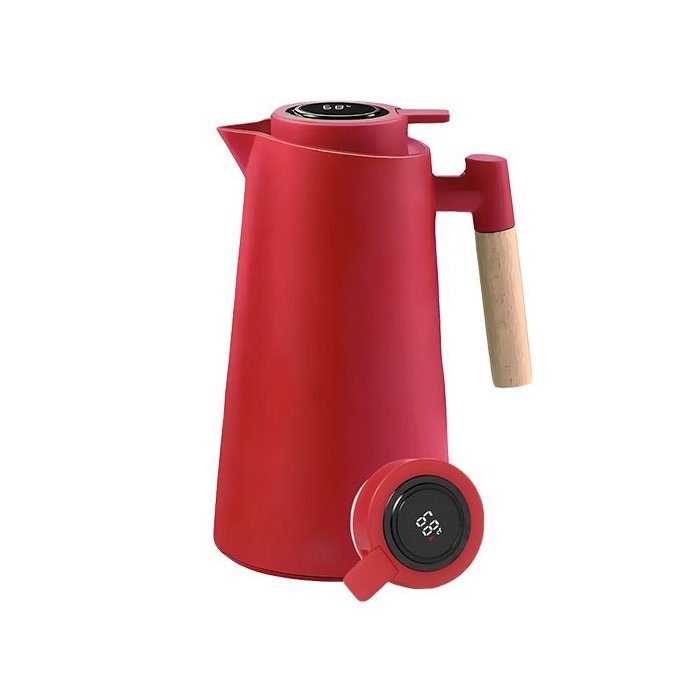 Garrafa Térmica de 1 Litro com Termômetro Digital Quente Frio Chá Café C/ Cabo de Madeira - Vermelho