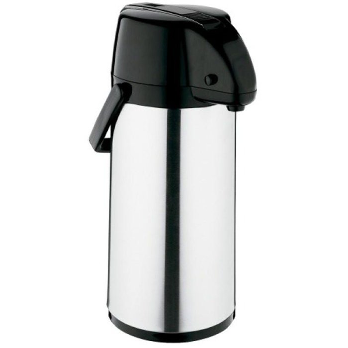 Corpo externo em aço inoxidável, acabamento escovado, tampa em polipropileno (PP). Cobertura em verniz: não suja e nem deixa marcas; Sistema de servir por alavanca com alta eficiência, servindo até 400ml por acionamento; possui ampola de vidro, ideal para líquidos quentes e frios. Alça retrátil para transporte. Possui base giratória que facilita no momento de servir.