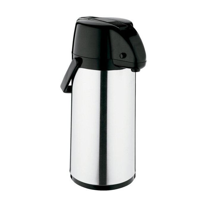 Corpo externo em aço inoxidável, acabamento escovado, tampa em polipropileno (PP). Cobertura em verniz: não suja e nem deixa marcas; Sistema de servir por alavanca com alta eficiência, servindo até 400ml por acionamento; possui ampola de vidro, ideal para líquidos quentes e frios. Alça retrátil para transporte. Possui base giratória que facilita no momento de servir.