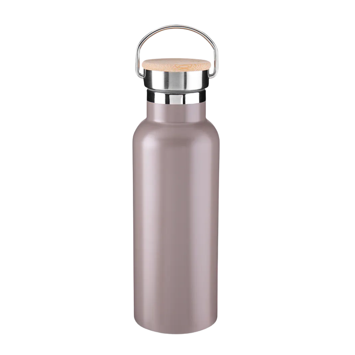Garrafa térmica em aço inox com parede dupla e isolamento a vácuo, com capacidade de até 500ml. Conserva líquido quente por até 5 horas e líquido frio até 8 horas. Tampa com revestimento em fibra de bambu. Alça em metal. Detalhe cromado. Pintura fosca.