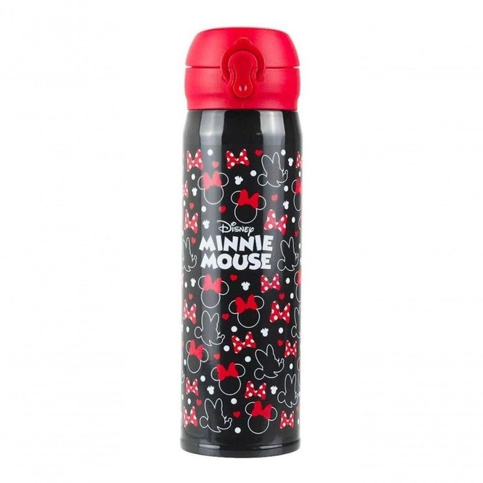 Garrafa térmica na cor preta com capacidade para 400 ml estampada com imagens da Minnie. Vem com tampa rosqueável, ideal para servir bebida no copo. Tempo médio de 4 a 6 horas de preservação de temperatura. Material: inox