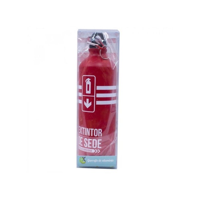 Garrafa vermelha de 750 ml gravada com a frase "extintor de sede". Tampa rosqueável com prendedor paa mochila. Material: alumínio. Detalhes: Peso 0,100 gramas; Altura 25cm; Largura 7cm; Comprimento 7cm.