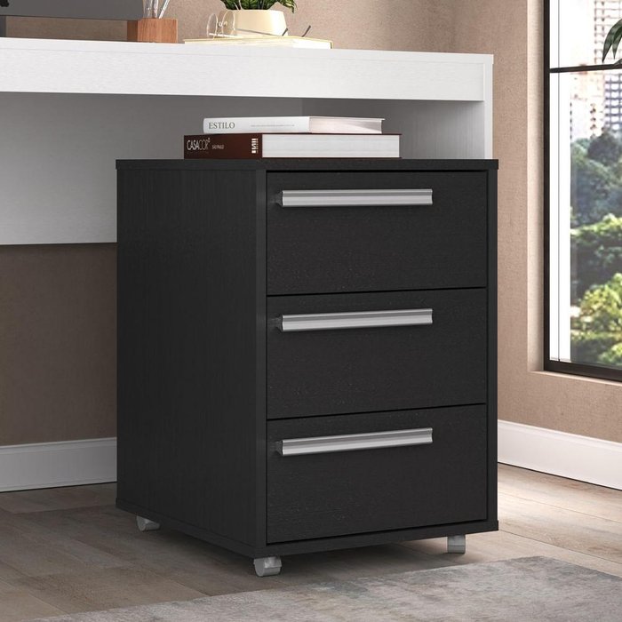Os gaveteiros metálicos e na cor preta são modernos, inclusive são ideais para o escritório de pessoas criativas, por exemplo.