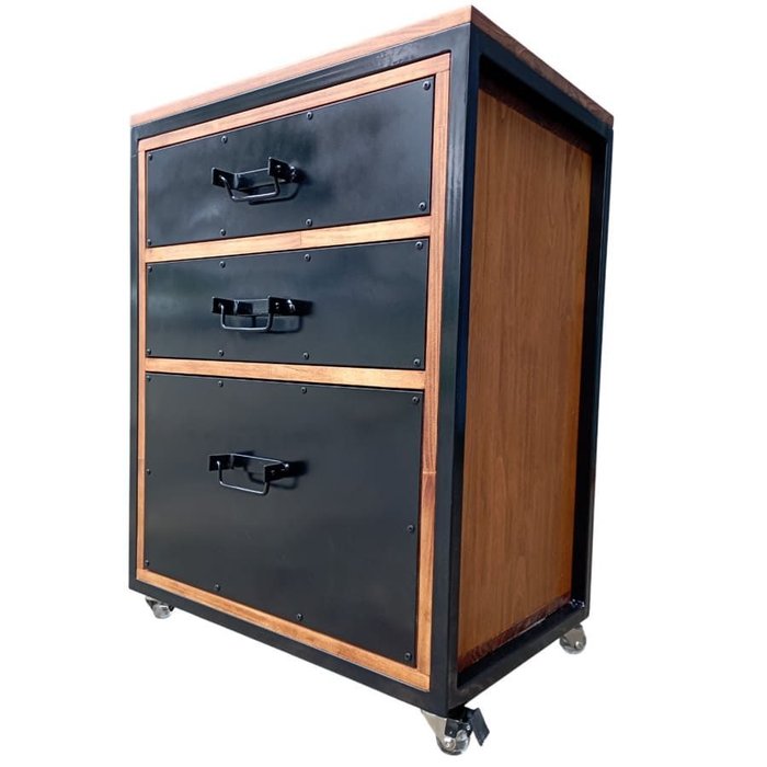 Gaveteiro de Madeira e Ferro Modelo Industrial com 3 Gavetas - Preto e Castanheira