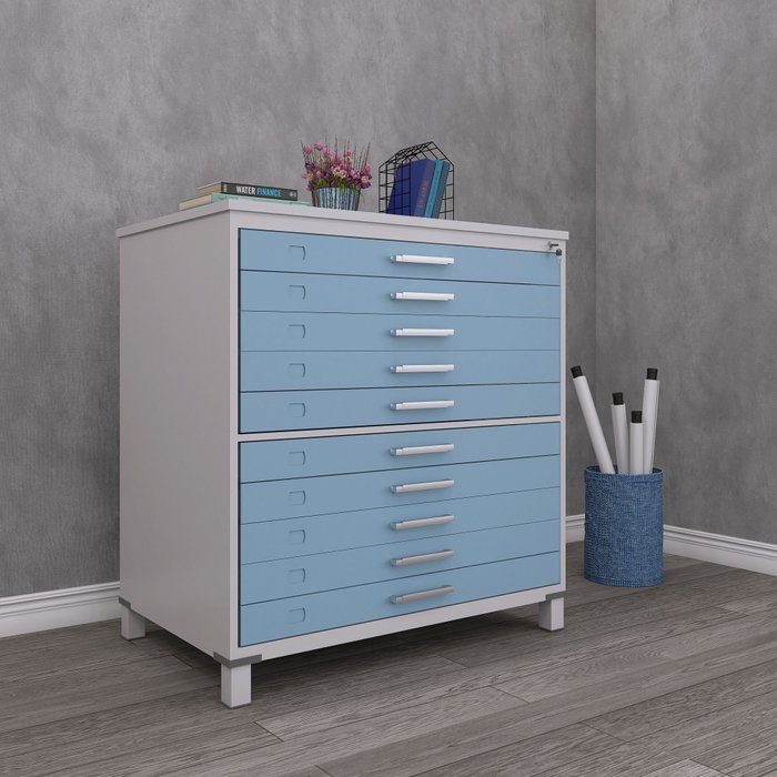 Gaveteiro Mapoteca para Escritório de Aço Fixa com 10 Gavetas Industrial Cinza/Azul Dali