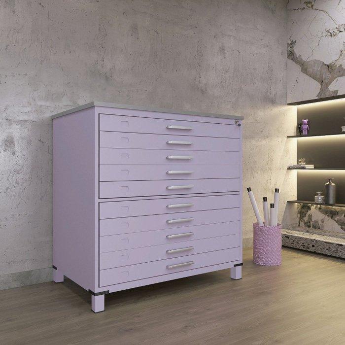 Gaveteiro Mapoteca para Escritório de Aço Fixa com 10 Gavetas Industrial Lilas/Cinza