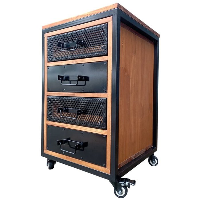 Gaveteiro para Escritório Estilo Industrial com 4 Gavetas - Ferro Preto e Madeira Castanheira