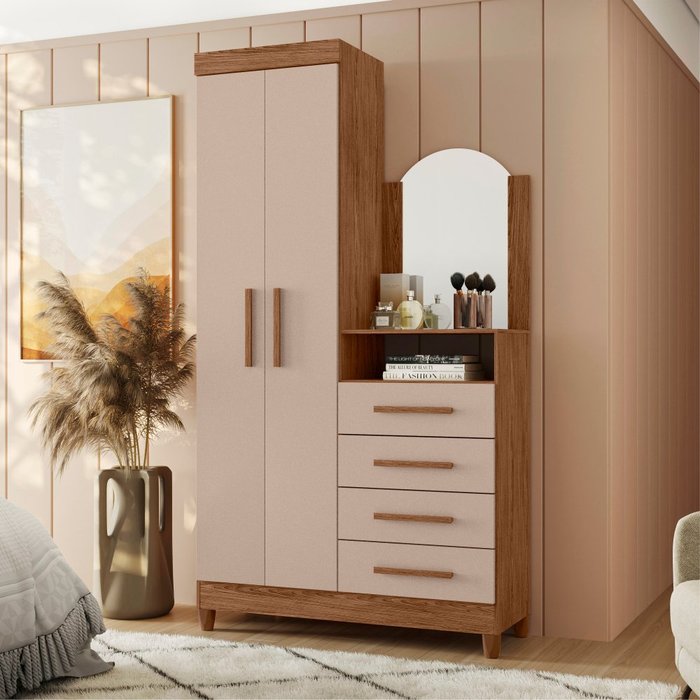 É Feito em MDP, com 2 Portas, Com Cabideiro Interno, Puxadores Com MDF Revestidos, Com Pés Inclusos, Espelho Incluso.