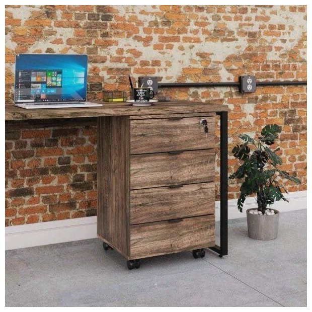 O gaveteiro volante KUGV44 tem um design diferenciado, possui 04 gavetas sendo 01 com chave além dos puxadores de metal e rodízios. Pode ser utilizado em diversas composições com outros móveis, sendo perfeito para fazer parte do seu escritório ou sala. A linha Kuadra tem seu design com inspiração no estilo industrial, que remete muito a decoração usada nos lofts das grandes metrópoles nos anos 60 e 70. Harmonizando o metal e os tons de madeira, foram projetados móveis versáteis e com estilo, que podem compor ambientes flexíveis cheios de personalidade, perfeitos para você decorar sua casa ou seu trabalho, tendo um resultado que caminha do estilo rústico ao moderno. Suas estruturas são fabricadas em aço, com soldas suavizadas e pintura texturizada epóxi-pó, conta com pés niveladores de altura e parafusos na cor preta. Para os tampos são utilizados mdp-bp acetinado com fitas de borda em pvc, dando uma maior durabilidade ao seu móvel.