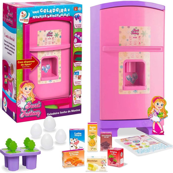 Sweet Fantasy Geladeira Sonho de Menina Com essa linda geladeira a diversão é garantida! A criançada pode juntar seus brinquedos e deixar a imaginação fluir... está linda geladeira é completa para a brincadeira ficar ainda mais realista. Produzida de material super resistente tornando a brincadeira da sua filha ainda mais segura. Especificações Técnicas: - Marca: Cardoso Toys - Idade Recomendada: Apartir de 3 Anos - Medidas Aproximadas da Geladeira (AxLxC): 50x25x17 cm - Medidas Aproximadas da Embalagem (AxLxC): 20x32x51 cm - Peso Aproximado da Embalagem: 1,500 Kg Conteúdo da Embalagem: - 1 Geladeira - 1 Dispenser na Porta - 1 Porta-ovos com 4 Ovos - 1 Fôrma para fazer Picolé - 1 Cartela de Adesivos - Caixinhas para Recortar - Prateleiras Internas