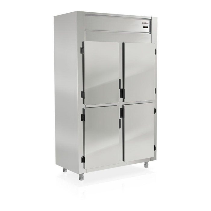 Refrigerador Comercial 4 Portas GREP4P Gelopar. Conservação e Exposição de produtos em cozinhas industriais de hotéis, restaurantes, clubes, bares, lanchonetes, confeitarias, mercados, mercearias e outros. Refrigeração: Ar forçado com evaporador aletado. Temperatura: 0 a +7C. Degelo: Automático. Controlador eletrônico com indicador de temperatura. Revestimento Interno: Aço Galvanizado. Revestimento Externo: Aço Inox 430. Resistência no quadro de portas. Prateleiras. 4 níveis, aramadas, reguláveis. Pés niveladores. Construção do Gabinete: Monobloco. Parte frontal com resistência no quadro de portas. PESO: 120 Kg. CAPACIDADE: 1044L. TEMPERATURA: 0° a +7°C CONSUMO: 4,7 kWh/dia. DIMENSÕES EXTERNAS (CxAxL): 118,3x203x66,6cm. Equipamento certificado conforme Portaria Inmetro nº 371/2009. Refrigerador Comercial 4 Portas GREP4P Gelopar é na Atau.