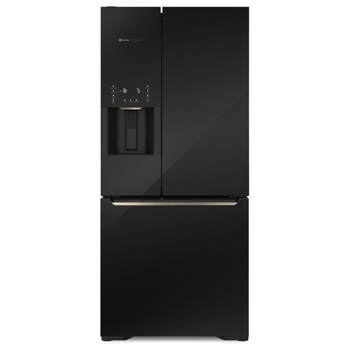 Geladeira Frost Free Electrolux Inverse 538 Litros 3 portas Preta DM86V Resumo A linha Pro Series Electrolux segue as tendências mais sofisticadas de design, com estilo e muito charme. É uma coleção de produtos que investe em elegância em cada detalhe, como por exemplo, no uso de Vidro Preto com detalhes na cor Light Gold e painéis touch em led branco, que atraem a atenção pelo bom gosto de sua concepção. Se você deseja opções que contribuam para um bom projeto de design de interiores, a linha Pro Series representa o máximo em estilo no mercado atual. O Refrigerador Electrolux DM86V tem como foco o conforto e praticidade na vida do usuário. Com um dispenser na porta, para maior comodidade na hora de tomar água ou de obter gelo em cubos ou picado. Tudo sem precisar abrir o Refrigerador. Esse Refrigerador Frost Free dispõe da tecnologia Inverter, ou seja, com menor consumo de energia, bem como menor ruído. Isso gera, inclusive, maior conservação dos alimentos em seu interior, pois há menor variações de temperatura. Com painel touch em led branco, dispõe de diversas funções, como turbo, festa, férias, drink express. Permitindo ajustar sua operação a cada ocasião, mantendo a temperatura adequada a cada uso. Sua gaveta HortiNatura conserva verduras por 60% mais tempo que gavetas comuns*. Suas prateleiras retráteis e com sistema Fast Adapt permitem utilizar de forma ajustável, todo o espaço interno, conforme suas necessidades. Prateleiras Fast Adapt Prateleiras deslizantes na contraporta: flexibilidade para adaptar o espaço aos diferentes tamanhos de embalagens e itens. Tudo isso na Geladeira Frost Free Electrolux. Dispenser de água e gelo: Água FRESCA e gelo, em cubos ou triturados, filtrados e prontos para o consumo, a qualquer hora, direto da porta da geladeira. *Teste aferido em folhas verdes