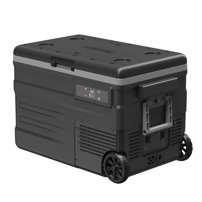 -A geladeira portátil 45 litros com rodas funciona ligada na tomada veicular em 12V/24V ou diretamente na energia elétrica convencional, com o uso da fonte em 110V/220V (Já inclusa).
