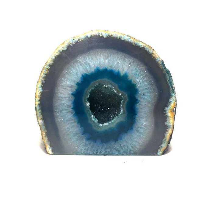 Pedras em Geodo - Ágatas - Decoração - Energia Emitimos Nota Fiscal Eletrônica para todos os Produtos. Valor referente à 1 unidade. Foto demostrativa do lote, podem conter pequenas variações no formato e na tonalidade. Caso queira ver as opções disponíveis em nosso estoque, é só mandar uma mensagem para nós e te enviaremos as fotos. Altura média 8cm. Largura média 9cm. Profundidade média 4cm. Peso médio de 560 gramas. A ágata verde passa por um tratamento para chegar nesta colocaração, por tanto há uma alteração na cor natural da pedra. A propriedade energética vibra conforme a cor da pedra. Não recomendamos o contato com água, a limpeza pode ser feita por fumaça de incenso, sol, lua, sal, emanação de energia ou de outra forma de sua preferência. Um pouco sobre a Pedra Ágata: As Ágatas são pedras que têm o poder de harmonizar yin e yang, as forças positiva e negativa que mantém o equilíbrio do universo. Tem grande poder de cura, trabalha com os chakras e age conforme a cor de cada tipo. Tonifica e revigora o corpo, ajuda a despertar e abrir o seu interior. Em crianças é usada como proteção. A Ágata promove a suave aceitação do próprio eu, estimulando a confiança em nós mesmos. Ela melhora a concentração, a percepção, facilitando a descoberta de soluções práticas. A ágata com cristais incolores pode estimular a memória. No fator emocional, a Ágata transmuta a negativa e a amargura, promovendo o amor e estimulando a coragem para recomeçar. Do ponto de vista espiritual, a Ágata eleva a consciência, estimula a contemplação silenciosa e a assimilação das experiências da vida. A Ágata estabiliza a aura, seu efeito purificador é poderoso tanto no nível físico quanto no emocional. Colocada sobre o coração, ela cura indisposições emocionais que impedem a aceitação do amor. Sobre o abdômen ou ingerida em forma de elixir, a Ágata estimula o processo digestivo e alivia a gastrite. Essa pedra também cura os olhos, o estômago, o útero, fortalece os vasos sanguíneos e cura problemas de pele. (A ágata verde passa por um tratamento para chegar nesta coloração, por tanto há uma alteração da cor natural da pedra Ágata neste caso).