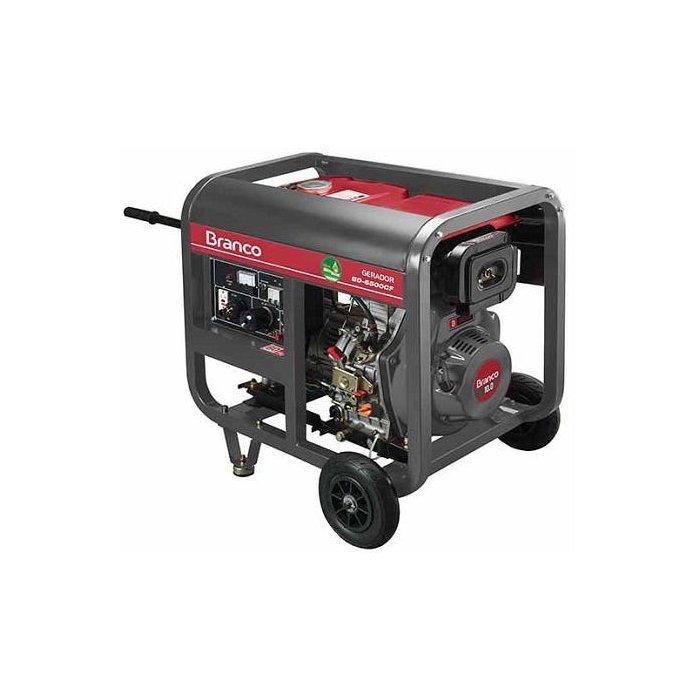 GRUPO GERADOR BRANCO BD6500 5 KVA 110/220V Referência: 90304420 Modelo: BD6500 CF Uso: Profissional Marca:BRANCO País de origem: CHINA Potência: 5 KVA / 5.5 KVA Voltagem: 110/220V Acionamento: Diesel Tanque de Combustível: 12,5 Litros Dimensões CxLxA: 78x55x72 cm Peso: 105 Kg Notas:Diesel , refrigerado a ar , partida retrátil , monofásico , sem escovas , frequência 60 Hz , voltímetro , carregador de baterias 12volts , com rodas , 100kg