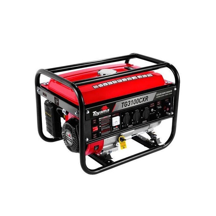 GRUPO GERADOR TOYAMA TG3100CXR 3.1 KVA 110/220V Referência: 201-025 Modelo: TG3100CXR Uso: Profissional Marca: TOYAMA País de origem: CHINA Potência: 2.800W / 3.100W Voltagem: 110V ou 220V Acionamento: Gasolina Tanque de Combustível: 15 Litros Dimensões CxLxA: 61x45x46 cm Peso: 45 Kg Notas:Gasolina , refrigerado a ar , partida manual , monofásico , com avr , voltímetro , frequência 60 Hz , carregador de baterias 12volts , alerta de óleo , 44kg