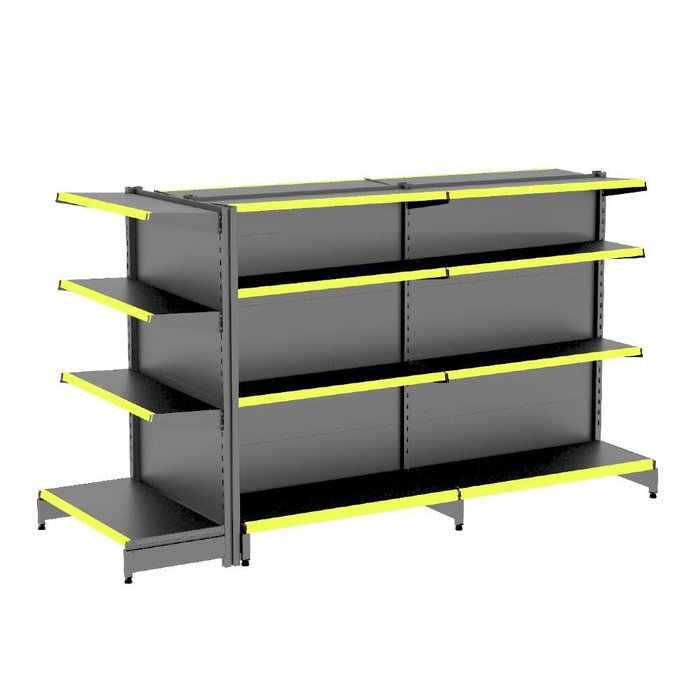 A Gôndola Premium Flex 40 Centro é ideal para farmácia, supermercados, mercearias, lojas de utilidades, materiais de construção, agropecuárias e outros. Devido sua altura permite uma visão ampla central do comércio.