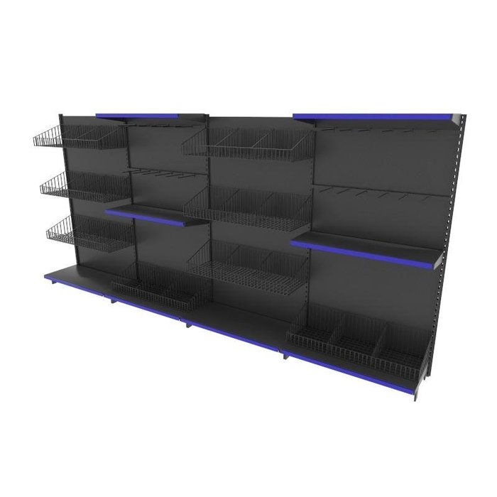 Gondola de aço Altura 170 cm Parede Bandejas 40/30 com Cestos e Ganchos Preto gp170praz1044