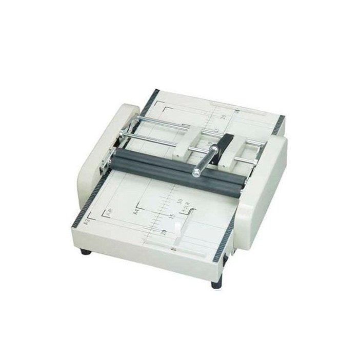 Equipamento semi-automático 2-em-1, grampeia e dobra em uma só operação. Solução ideal para pequenos espaços e projetado para agilizar o processo de encadernação.