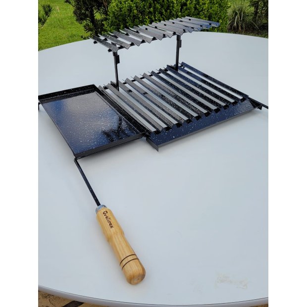 Possui grelha de descanso, muito utilizada para auxílio na hora do preparo das guarnições, como legumes, pão de alho e finalização o ponto da carne. A grelha argentina, também conhecida como parrilla, é composta por canaletas em “V” que não deixam a gordura do alimento entrar em contato com o carvão. Ou seja, é ideal para quem não quer muita fumaça no cozimento, o que ajuda se você mora em um prédio, por exemplo.