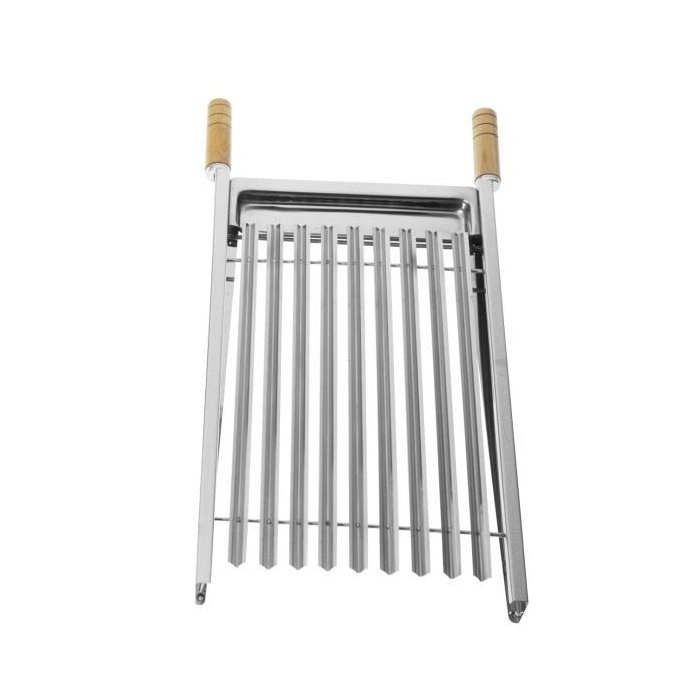 Grelha para uso genérico, com o diferencial que possui um excelente acabamento.– Feita em aço inox, com cabos de madeira.