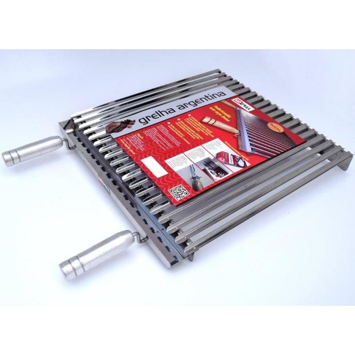 Grelha Argentina Upgrill: Muito utilizada atualmente, possui canaletas em U que conduzem a gordura para um coletor. Reduz a gordura que pinga sobre o braseiro pela metade, e consequentemente a fumaça. Os cabos estão deslocados das extremidades e as canaletas são fixadas com rebites, sem solda. Fabricada em inox.