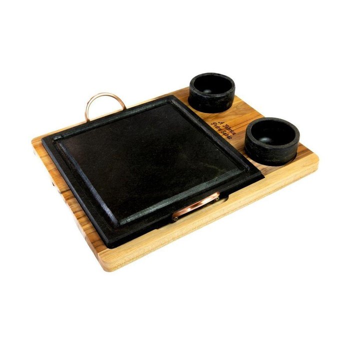 Grelha com 02 Molheiras em Pedra Sabão e Suporte G 25x25cm Ela é antiaderente naturalmente, o que facilita sua higienização (limpeza) e termicamente considerada inerte, ou seja, demora esfriar o alimento. Sua utilização pela população local baseia-se no preparo de carnes, grelhados, peixes e etc. Surpreenda sua família e amigos servindo aquele saboroso churrasco nesta grelha de pedra. Acompanha as molheiras, você vai poder combinar seus molhos favoritos com as refeições. Além de poder grelhar a carne diretamente na pedra, também é possível aquecer a pedra e usá-la para servir porções quentes por mais tempo, pois ela se manterá quente mesmo após retirar do fogo. É um ótimo produto para servir porções, tanto no restaurante para os clientes como em almoços de família, lanches no fim da tarde, reuniões e etc. Obs: as peças de pedra de sabão já vão curadas. Características Técnicas: