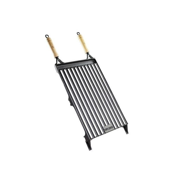 Grelha Argentina Pampa. Fabricada em Ferro Fundido com alças de madeira. Ela possui o estilo Argentino, com canaletas que absorvem a gordura, com isso não causa fumaça e segura muito mais a temperatura. O Sabor da Carne será um diferencial no seu churrasco. Dimensões: 35 Largura x 59 Altura x 4 de Espessura.