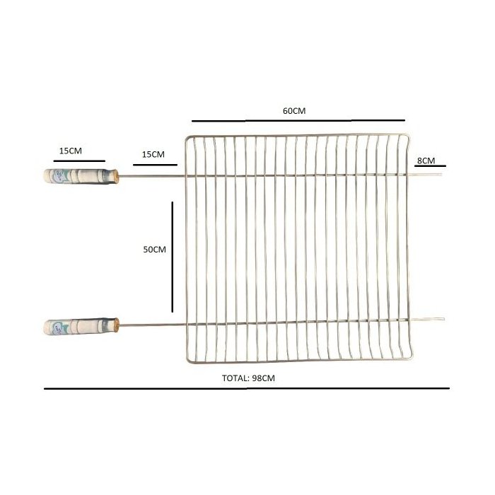 Grelha Para Churrasco 60X50 Em Aço Inox 8mm Com Cabo Revestido em Alumínio - Acompanha um Garfo. DESCRIÇÃO: AS GRELHAS EM AÇO INOX PARA CHURRASCO SÃO ALTAMENTE SEGURAS PARA O PREPARO DE CARNES, LEGUMES, PEIXES E ENTRE OUTROS ALIMENTOS. POIS NÃO CONTAMINAM OS ALIMENTOS COM METAIS BEM COMO NÃO ABSORVEM O SABOR E O ODOR. PERMITINDO FAZER ASSADOS SEM QUALQUER ALTERAÇÃO NO SEU SABOR. O AÇO INOX É UMA LIGA METÁLICA COMPOSTA DE FERRO, CROMO, CARBONO E NÍQUEL BASTANTE RESISTENTE À CORROSÃO E AO CALOR. ENQUANTO OS AÇOS COMUNS SOFREM O PROCESSO DE FERRUGEM, O AÇO INOX É GERALMENTE MUITO RESISTENTE À CORROSÃO E MUITO MAIS FÁCIL PARA SER LIMPADO. OS CABOS SÃO EM MADEIRA COM O REVESTIMENTO EM ALUMÍNIO DE ALTA QUALIDADE E PADRÃO. ACOMPANHA UM GARFO P/CHURRASCO AÇO INOX COM O CABO REVESTIDO EM ALUMÍNIO. EMBALAGEM CONTÉM: 1 - GRELHA ARAMADA 1 - GARFO CARACTERISTICAS: MODELO: GRELHA ARAMADA MATERIAL DA GRELHA: AÇO INOX 6MM TAMANHO DA GRELHA TOTAL: 99CM TAMANHO DA GRELHA: COMPRIMENTO: 60CM LARGURA: 50CM ESPESSURA DA GRELHA: 8MM TAMANHO DO CABO: 15CM COMPRIMENTO DO GARFO: 60CM CABOS: MADEIRA REVESTIDO COM ALUMÍNIO DICAS DE SEGURANÇA e LIMPEZA * Utilize luvas ao manusear utensílios quentes. * Este produto não pode sofrer modificações e todas as peças só podem ser substituídas por peças originais. * Antes de utilizar, remova as etiquetas e lave a sua grelha com uma esponja macia, utilizando sabão neutro. * Enxugue bem com um pano macio, e já estará pronto para usar. * Para manter o sua grelha limpa e conservada, basta lavar com água, detergente ou sabão neutro, utilizando uma esponja macia. * Enxugue o a sua grelha imediatamente após a lavagem para prevenir manchas.