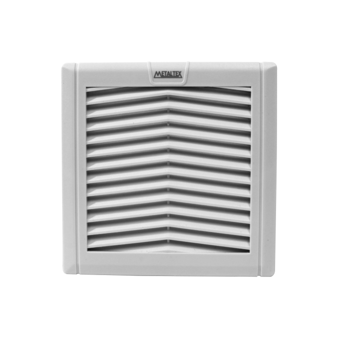 Grelha plástica protetora para ventiladores de 120mm. Cor cinza clara. Acompanha filtro de fibra sintética com construção progressiva, resistente a temperaturas de 100°C, classe auto extinguível F1, resistente a umidade a 100% RH, reutilizável. Grau de proteção IP54.