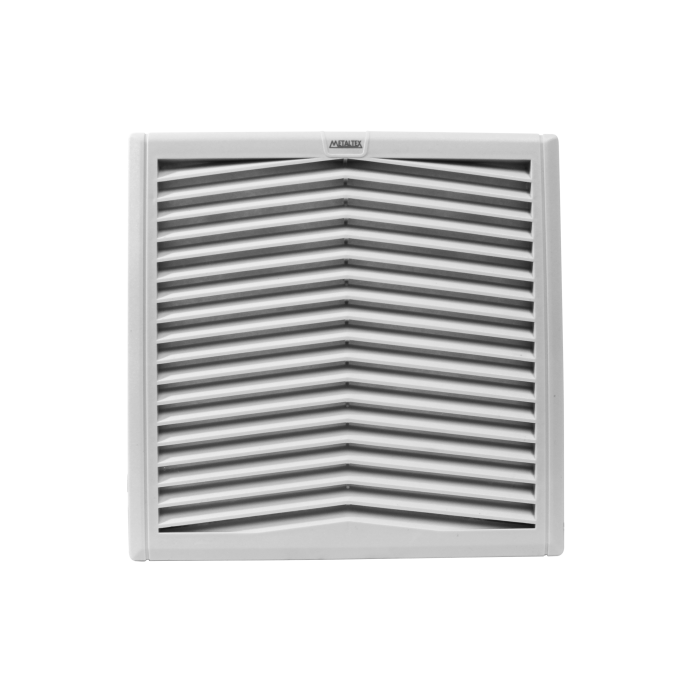 Grelha plástica protetora para ventiladores de 180mm. Cor cinza clara. Acompanha filtro de fibra sintética com construção progressiva, resistente a temperaturas de 100°C, classe auto extinguível F1, resistente a umidade a 100% RH, reutilizável. Grau de proteção IP54